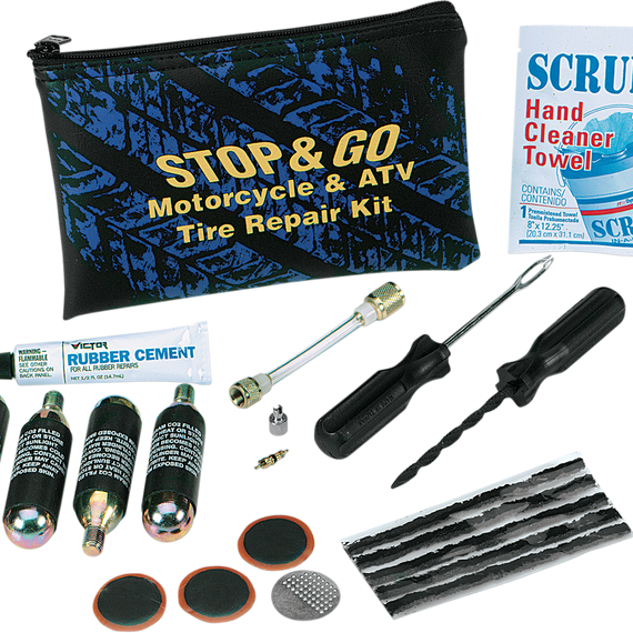 Caracteristicas: Immediate trail or roadside repair and reinflation of a punctured tire Kit contains patches and plugs, plus 4 CO² canisters and adapter for immediate inflation; also includes rubber cement, repair tools, valve cap, replacement core, hand cleaner and towel in a zippered vinyl pouch CO² cartridges cannot be transported on an aircraft.