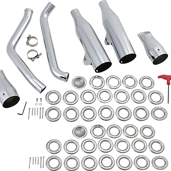 Caracteristicas: Features SuperTrapp tunable 3" internal disc mufflers with chrome taper slash end caps Durable steel construction with brilliant chrome-plating Includes 18 3" discs per muffler body, mounting hardware, and heat shields End cap is interchangeable with any 3" SuperTrapp end cap Uses OEM heat shields and mounting bracket Made in the U.S.A.