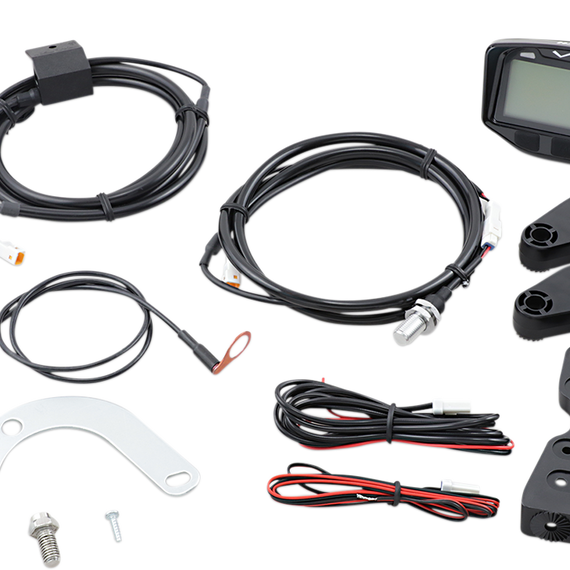 Caracteristicas: Speed, temperature, distance, tachometer and clock Speedometer functions: current, average, maximum; selectable mph/kph Temperature functions: ambient temp, engine temp with LED alerts, dual programmable temp lights, exact model fit temp sensors; selectable F/C scale Distance functions: adjustable distance, permanent odometer; selectable mile/kilometer Tachometer functions: real-time rpm bar graph, numeric rpm readout, dual programmable shift lights; up to 20000 rpm Clock functions: hour meter, stop watch, ride time; selectable 12/24 hour display Include universal power connector for all machines and accepts AC and DC power Waterproof design with high-intensity LCD white backlight display