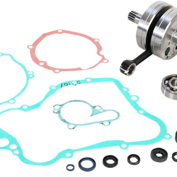 Caracteristicas: Include crankshaft, top end bearing, premium main bearings and a complete bottom end gasket set that includes all seals and gaskets needed to do the job Only one part number to stock and order Crankshafts are factory assembled and precision trued to OEM specifications Double-forged Wiseco connecting rods maintain superior dimensional consistency through improved grain flow Shot-peening eliminates residual stresses and smoothly blends the rod forging surfaces Corrosion-resistant surface treatment Top and bottom end rod bores case hardened to 58-62 RC to optimize bearing running surface Crank pin bearing radial running clearance is optimized to ensure maximum performance Precision honing ensures ultra round bearing surface Precision engineered oiling slots maximize rod strength and bearing life Double-drilled small ends provide the piston pin with extra lubrication and cooling, reducing distortion of top end due to thermal transfer from the piston Silver-coated bronze phosphor thrust washers, with dimpled design to increase oil retention and reduce friction between rod and washer interface Crank pin bearings are manufactured from the highest quality hot rolled steel; case-hardened to 58-62 RC Caged needle roller bearings provide the highest possible rpm Precision machined crank webs