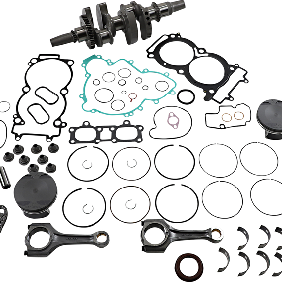 Caracteristicas: Complete engine rebuild kit Includes crankshaft, piston kit, complete engine gasket kit with oil seals, main bearings and seals, water pump rebuild kit, transmission bearings, countershaft bushing/seal kit, wrist pin bearing, cam chain and counter balancer bearings when applicable