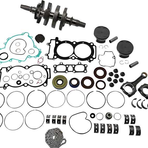 Caracteristicas: Complete engine rebuild kit Includes crankshaft, piston kit, complete engine gasket kit with oil seals, main bearings and seals, water pump rebuild kit, transmission bearings, countershaft bushing/seal kit, wrist pin bearing, cam chain and counter balancer bearings when applicable