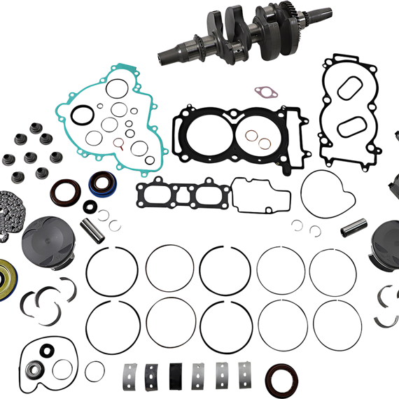 Caracteristicas: Complete engine rebuild kit Includes crankshaft, piston kit, complete engine gasket kit with oil seals, main bearings and seals, water pump rebuild kit, transmission bearings, countershaft bushing/seal kit, wrist pin bearing, cam chain and counter balancer bearings when applicable