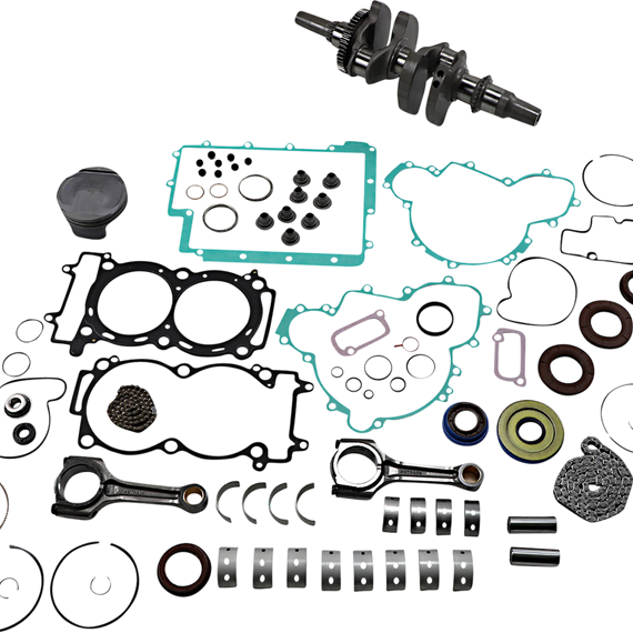 Caracteristicas: Complete engine rebuild kit Includes crankshaft, piston kit, complete engine gasket kit with oil seals, main bearings and seals, water pump rebuild kit, transmission bearings, countershaft bushing/seal kit, wrist pin bearing, cam chain and counter balancer bearings when applicable