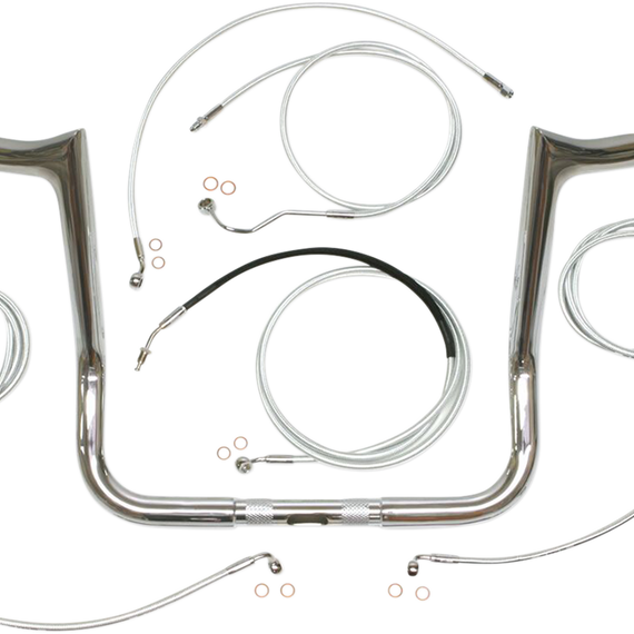 Caracteristicas: The only complete handlebar kits with matching braided cables and brake lines that include Magnum Viking Handlebars Patented Viking handlebar internal design guarantees easy installation of complete wiring harnesses without taking away from the clean look of the peak Novel design creates enough room to allow the complete wiring harness with factory vinyl covering and the terminal connections, along with their respective shrink sleeve to easily pass through without chaffing Using a unique flaring process, the burr-free internal radius creates a generous pocket of additional clearance within the troublesome peak of the handlebar To make wiring installations even easier, Magnum preloads the bars with E-Z pull-thru plastic woven sleeving Aggressive looking Viking handlebars are manufactured with the highest-quality construction, work with standard controls, including hydraulic clutch Each 1-14" diameter handlebar is CNC mandrel bent for an accurate fit, incorporates wrist angles for engineered riding comfort, has 1" diameter center sections, 3-1/2" on-center knurling and features machined control mounts (not swaged) and burr-free internal wiring holes and electronic control slots Kits include: Magnum Viking Handlebars, throttle and idle cables or Throttle-By-Wire extensions, clutch cable or hydraulic clutch line, brake lines, copper crush washers, hardware and any necessary switch or turn signal extensions Cables and brake lines feature Sterling Chromite II braid with highly-polished chrome-plated fittings All cables are a low-effort, high-efficiency design that meets or exceeds all OE specifications for fitment, construction and endurance Brake lines are compliant with DOT FMV55-106 Specifications Assembled in the U.S.A. Cable and line lengths are based on 2" risers, except for touring models Viking handlebars have a 1" diameter center section and fit 1" risers. Models originally equipped with handlebars larger than 1" will require changing the risers to a 1" ID version