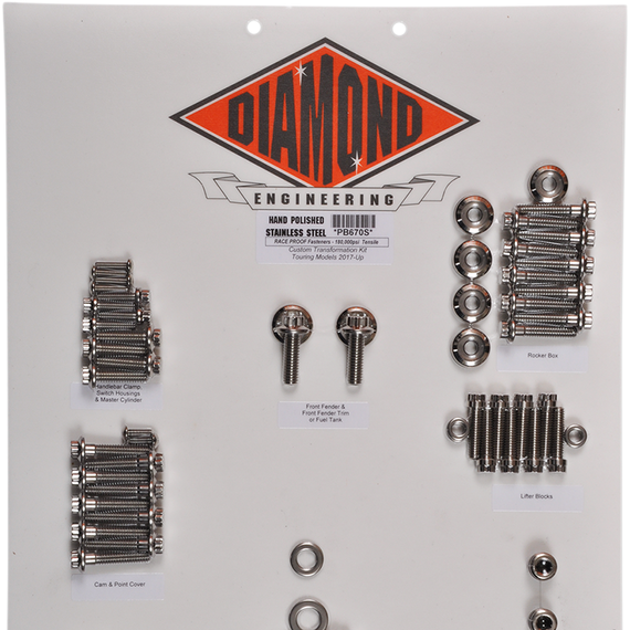Caracteristicas: Customize a bike without having to completely disassemble it Groups of polished stainless steel fasteners covering the engine, transmission and the most visible areas of the motorcycle Kits add detail and a custom look with ease Kits include fasteners for primary, inspections and inner primary; cam and points; oil pump or oil line cover, filter mount and sensors (Dyna and Twin Cam FLHT) or oil filter plugs and sensors (Softail Twin Cam); lifter blocks; rocker box; coil and circuit breaker covers (Dyna); transmission side cover; oil filler (FLHT models); transmission top cover; handlebar clamp, switch housings and master cylinder; front fender or front fender trim and fuel tank (FLHT models); rear fender rail or swingarm pivot blocks and rear floorboard brackets (FLHT models) Made in the U.S.A.
