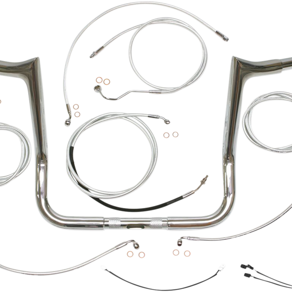 Caracteristicas: The only complete handlebar kits with matching braided cables and brake lines that include Magnum Viking Handlebars Patented Viking handlebar internal design guarantees easy installation of complete wiring harnesses without taking away from the clean look of the peak Novel design creates enough room to allow the complete wiring harness with factory vinyl covering and the terminal connections, along with their respective shrink sleeve to easily pass through without chaffing Using a unique flaring process, the burr-free internal radius creates a generous pocket of additional clearance within the troublesome peak of the handlebar To make wiring installations even easier, Magnum preloads the bars with E-Z pull-thru plastic woven sleeving Aggressive looking Viking handlebars are manufactured with the highest-quality construction, work with standard controls, including hydraulic clutch Each 1-14" diameter handlebar is CNC mandrel bent for an accurate fit, incorporates wrist angles for engineered riding comfort, has 1" diameter center sections, 3-1/2" on-center knurling and features machined control mounts (not swaged) and burr-free internal wiring holes and electronic control slots Kits include: Magnum Viking Handlebars, throttle and idle cables or Throttle-By-Wire extensions, clutch cable or hydraulic clutch line, brake lines, copper crush washers, hardware and any necessary switch or turn signal extensions Cables and brake lines feature Sterling Chromite II braid with highly-polished chrome-plated fittings All cables are a low-effort, high-efficiency design that meets or exceeds all OE specifications for fitment, construction and endurance Brake lines are compliant with DOT FMV55-106 Specifications Assembled in the U.S.A. Cable and line lengths are based on 2" risers, except for touring models Viking handlebars have a 1" diameter center section and fit 1" risers. Models originally equipped with handlebars larger than 1" will require changing the risers to a 1" ID version