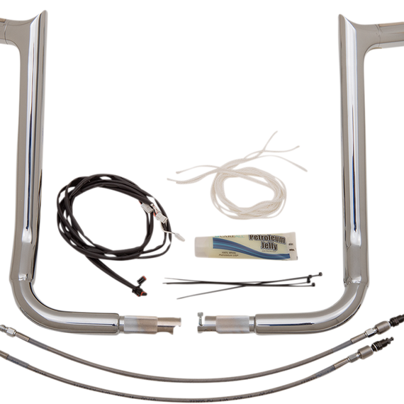 Caracteristicas: Adjustable 1-½” collar next to handlebar controls for custom look Revolutionary bolt-together  two-piece handlebar design that takes up half the shelf space, is easy to ship and even faster to install CNC mandrel-bent from 1-1/2" diameter x .095" wall heavy tube EZ install means no more need to fight internal wiring; install handlebar wiring in minutes Billet machined top with a large internal machined radius allows for EZ pulling of wiring (non-welded top corner) Install kits include everything needed to install the handlebars in half the time of other kits due to our design that only extends the existing clutch cable/ clutch line and brake lines Handlebars are knurled and notched for TBW applications Made in the U.S.A. Accepts OEM heated grips Patent No. 10,946,926