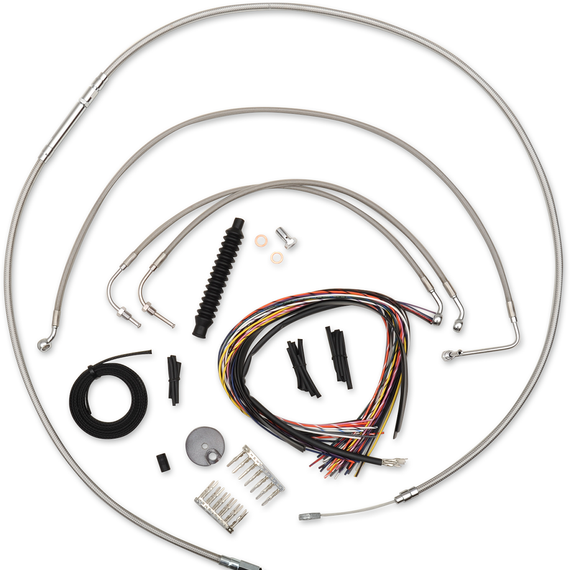 Caracteristicas: Take "cable calculation" headaches out of swapping handlebars Kits give you the correct length cables, brake lines and wire extensions you need so you can complete a handlebar swap Stainless braided kits include throttle cable, idle cable (unless noted), clutch cable, brake lines, chrome "T" brake line junction, banjo bolts, fittings and copper crush washers Made in the U.S.A. Kits are based on using 2" risers with Ape Hanger handlebars