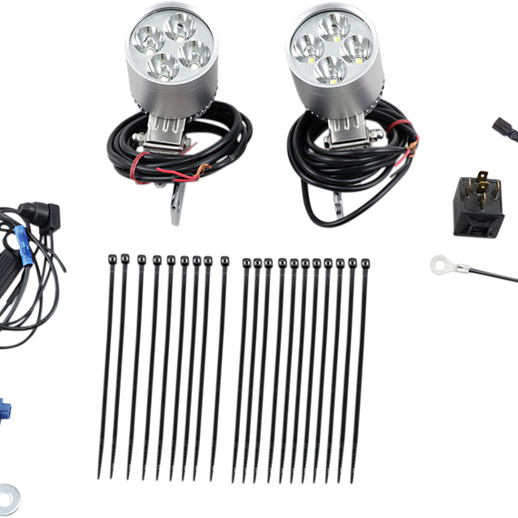 Caracteristicas: Significantly increases daytime visibility and nighttime vision High-output 3000 Lumen LED lights in 6000K daylight white Low power consumption and cool running Silver anodized aluminum housings Mounts to fender support brackets Lights turn with steering Includes lights, dash-mounted switch, relay, all wiring and simple-to-follow instructions Made in the U.S.A.