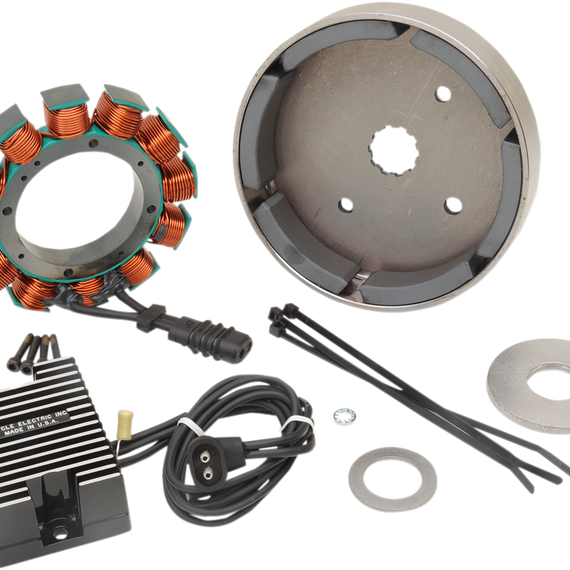 Caracteristicas: Kits include stator, rotor, black rectifying voltage regulator and mounting hardware Made in the U.S.A. Adding electrical accessories increases amperage usage. When doing so, it is important to consider amperage ratings of switches and wires. If you draw too many amps through a switch or wire, it will heat up and may burn. Fuses and breakers are sized to protect wiring and switches. DO NOT CHANGE 30A MAIN BREAKER TO A 50A BREAKER. THE SWITCHES AND WIRING WILL NOT BE PROTECTED.