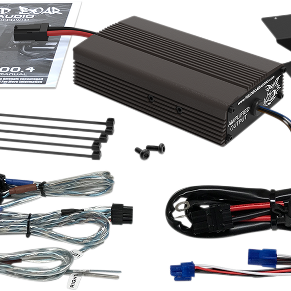 Caracteristicas: 150 watts x 2 @ 4 ohms Includes mounting plates for Batwing models. Road Glide models require part number 4405-0543 Wild Boar Class D amp with R.E.M.I.T. Exclusive to Powersports Audio Brands! Reduced EMI Technology (R.E.M.I.T.) gives superb FM reception from a class D amp Made specifically to work best with factory HD radio. No crossover, gain, or EQ adjustments make installation very easy Amplifier designed around small factory charging system 100% plug and play Includes beautiful 10 gauge power harness Average current draw (music) 12.8 amps @ 13.8V Amp will auto shut off below 10.5V to protect bikes charging system Discrete surface mount technology DC sensing turns amp on/off without additional wiring May require a OEM or Techno Research dealer radio "reflash" for best performance