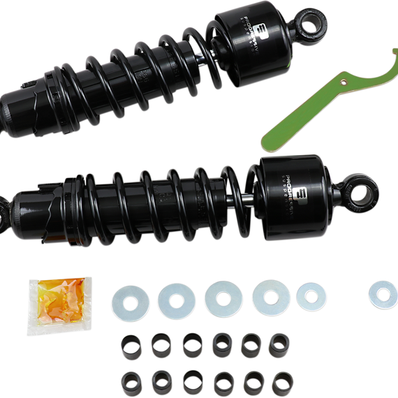 Caracteristicas: Designed specifically for Harley models The 412's simple, durable design makes them a cost effective improvement to your motorcycle's suspension performance A five position cam style spring load preload adjuster lets you easily dial in your ride Some or all shocks listed have TüV approval. Refer to most recent TüV certificate for current listing All shocks are measured center-of-eyelet to center-of-eyelet. When installing shocks on 1986-2015 XL models, it may be necessary to modify or space the chain/belt guard to allow proper clearance. A shock which is slightly longer than stock may alter the head angle slightly and provide somewhat quicker steering. A shock which is slightly shorter than stock may alter the head angle slightly and provide somewhat slower steering. Heavy Duty Applications are recommended for bikes that are operated at or near the manufacturer's maximum load rating over 50% of the time. Before purchasing or attempting to install shocks that are different than the OEM length, confirm that your wheel travel can be altered without causing clearance issues, such as swingarm/axle to exhaust contact as well as chain/belt guard or tire contact.