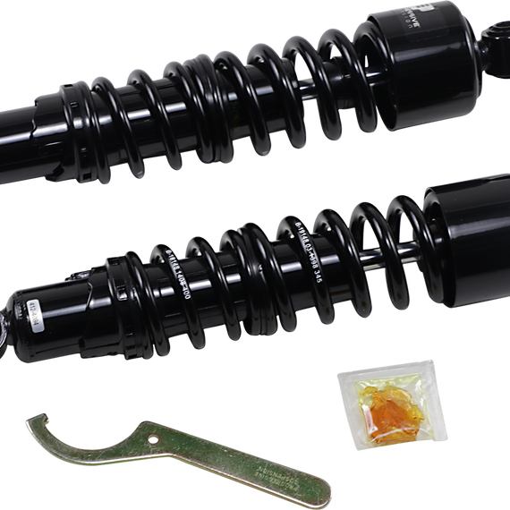 Caracteristicas: Designed specifically for Harley models The 412's simple, durable design makes them a cost effective improvement to your motorcycle's suspension performance A five position cam style spring load preload adjuster lets you easily dial in your ride Some or all shocks listed have TüV approval. Refer to most recent TüV certificate for current listing All shocks are measured center-of-eyelet to center-of-eyelet. When installing shocks on 1986-2015 XL models, it may be necessary to modify or space the chain/belt guard to allow proper clearance. A shock which is slightly longer than stock may alter the head angle slightly and provide somewhat quicker steering. A shock which is slightly shorter than stock may alter the head angle slightly and provide somewhat slower steering. Heavy Duty Applications are recommended for bikes that are operated at or near the manufacturer's maximum load rating over 50% of the time. Before purchasing or attempting to install shocks that are different than the OEM length, confirm that your wheel travel can be altered without causing clearance issues, such as swingarm/axle to exhaust contact as well as chain/belt guard or tire contact.
