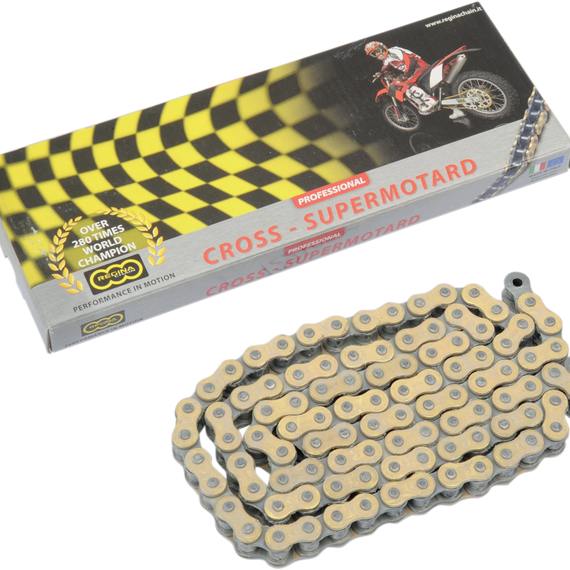 Caracteristicas: The ultimate off-road chain, developed to withstand the severe stresses of off-road riding, yet lightweight with maximum performance Featuring specially shaped bushings and chromized pins for reduced elongation and maximum wear resistance Larger diameter alloy carbon steel pins and thicker plates, shot-peened to provide increased tensile strength and better fatigue resistance Extended bushings and solid rollers provide improved durability Inner links are beveled to improve sprocket engagement, even in the worst off-road conditions Clip-type link included