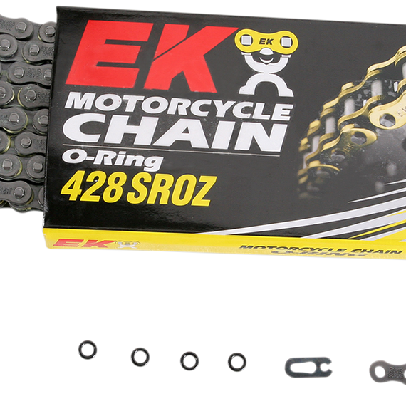 Caracteristicas: Value O-ring chain that doesn't compromise quality or durability Heat-treated steel alloy construction O-ring seals lock in lube, lock out grit Comes with semi-press fit clip connecting link