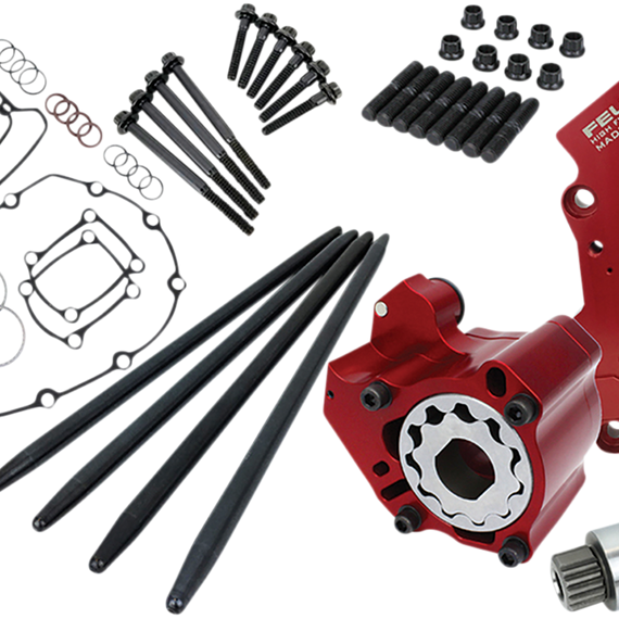 Caracteristicas: Feuling® complete camchest kits include all necessary components from top to bottom of the camchest conveniently packaged under one part These combination kits not only ensure each individual part is designed to work and function together, but to do so in total harmony These camchest kits take the guesswork out of the ordering process and provide the engine builder maximum reliability, peak performance and the coolest engine/ oil temperatures obtainable Complete Camchest Kits include: Feuling® High Volume oil pump, High Flow camplate, 472 Reaper® Series camshafts, hydraulic roller lifters, fixed length pushrods, Timken®/ Koyo® cam bearings, rocker arm studs/ nuts, gaskets, O-rings, ARP® cam/ crank fasteners, washers, moly paste and Loctite® Race Series® kits include a Race Series® oiling system (billet 7075 oil pump, Race Series® lifters, High Flow billet 7075 aluminum camplate Billet 7075 aluminum oil pump, which is 50% harder and stronger than the factory pump, holding tighter tolerances under temperature, deeper scavenge kidneys over Fueling HP+ oil pump Deeper scavenge kidney ports over the HP+ series for even more scavenge flow volume Race Series® hydraulic lifters have a full .200” of total travel designed with a slower bleed-down rate to handle heavy valve spring pressures, increase engine rpm before valve float and feature increased roller clearance for steep ramped camshafts and clearance for the M-Eight front exhaust camshaft lobe flange 30% more pressure gear volume over stock for M-Eight Twin-Cooled motors 53% more scavenge gear volume over stock for M-Eight Twin-Cooled motors 27% more pressure and scavenge gear volume over stock for M-Eight Oil-Cooled motors 2% more scavenge volume with port sizing, matched passages and holes to the engine case for M-Eight Twin-Cooled motors and M-Eight Oil-Cooled motors 68% more oil volume to the crankshaft and connecting rod bearing for M-Eight Twin-Cooled™ motors and M-Eight Oil-Cooled motors 15-25 degree cooler engine temperatures for M-Eight Twin-Cooled™ motors and M-Eight Oil-Cooled motors 15-30 degree cooler oil temperatures for M-Eight Twin-Cooled™ motors and M-Eight Oil-Cooled motors 10-30 more psi of oil pressure for M-Eight Twin-Cooled™ motors and M-Eight Oil-Cooled motors Increase oil pressure, scavenge volume and engine oil flow Quieter and smoother engine operation Reduces wet sumping, blowby and oily air cleaners Magnets in oil pump to help protect gears and pressure relief valve Test results show 2 hp gain and 2 ft/lbs of TQ gain to the rear wheel on M-Eight Feuling test results show a 50% reduction of engine sump oil level Made in the U.S.A