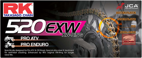 Caracteristicas: High-speed, extreme heat performance chains that can handle large cc engines Suitable for up to 750cc off-road motorcycles Chains include clip connecting link