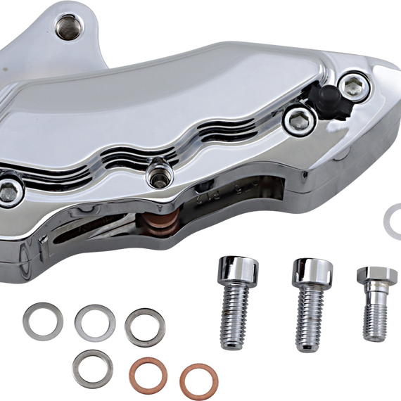Caracteristicas: Precision CNC-machined chromed billet aluminum construction Features differential bore technology, stainless steel pistons and chrome hardware Quick-change design for easy pad maintenance Dual, hidden bleeder for easy bleeding For use with custom 13" rotors only Made in the U.S.A. For replacement pads, see 1721-2455 or 1720-0215