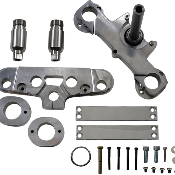 Caracteristicas: Get that longer Bagger look Increase frame-to-fender clearance for larger front wheels No modifications to OEM frame needed Accept all OEM components Maintain stock ride height of the vehicle Reduced steering effort on bikes with trike conversions installed without eliminating steering feel - reduced effort leads to reduced rider fatigue, allowing for longer rides