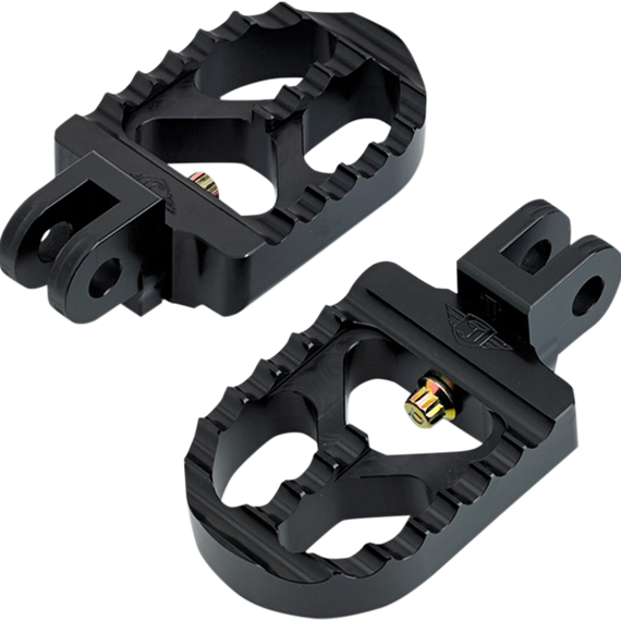 Caracteristicas: Pegs have a serrated foot surface area that gives a wider area for the boot and provides good "bite" for added grip Pegs are fully CNC machined from solid 6061-T6 aluminum bar Super-strong, lightweight 2-piece construction Pegs can be rotated a full 360° for optimum placement Will not fit passenger pegs Made in the U.S.A.