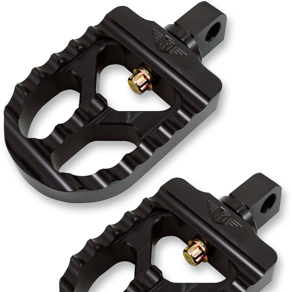 • Give your bike a unique design twist with these all-billet aluminum adjustable serrated footpegs