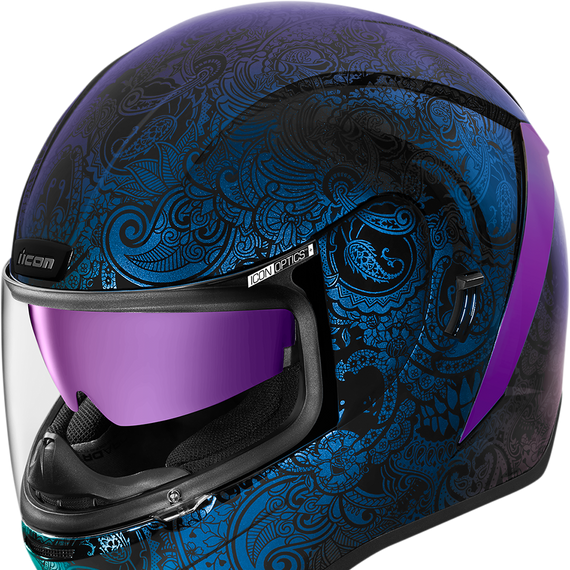 Caracteristicas: Injection molded polycarbonate shell for strength Internal airflow geometry and continuous venting system keep rider cool Fog-free Icon Optics™ shield with Rapid-Release™ system Prolock™ positive shield-locking system TracShield™ shield with tear-off posts available; sold separately Internal Dropshield with exterior switch Comfortable sculpted neck roll Removable molded breath deflector Fully removable Hydradry™ 3-piece moisture wicking liner Internal speaker pockets work with Icon's R.A.U. Bluetooth® device Does not ship with PSC or MFJ certification stickers unless purchased from an authorized dealer in that country The Dropshield™ visor must only be used while the main face shield is in the fully closed position