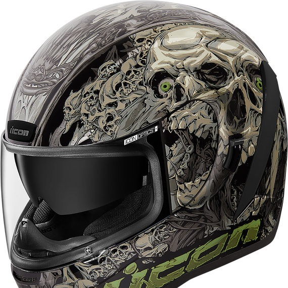 Caracteristicas: Injection molded polycarbonate shell for strength Internal airflow geometry and continuous venting system keep rider cool Fog-free Icon Optics™ shield with Rapid-Release™ system Prolock™ positive shield-locking system TracShield™ shield with tear-off posts available; sold separately Internal Dropshield with exterior switch Comfortable sculpted neck roll Removable molded breath deflector Fully removable Hydradry™ 3-piece moisture wicking liner Internal speaker pockets work with Icon's R.A.U. Bluetooth® device All World Standard meets or exceeds the following: DOT FMVSS 218 (USA), ECE 22-05 (Europe), & PSC (JAPAN) helmet safety standards Does not ship with PSC or MFJ certification stickers unless purchased from an authorized dealer in that country The Dropshield™ visor must only be used while the main face shield is in the fully closed position