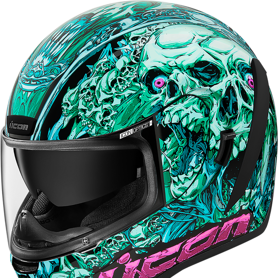 Caracteristicas: Injection molded polycarbonate shell for strength Internal airflow geometry and continuous venting system keep rider cool Fog-free Icon Optics™ shield with Rapid-Release™ system Prolock™ positive shield-locking system TracShield™ shield with tear-off posts available; sold separately Internal Dropshield with exterior switch Comfortable sculpted neck roll Removable molded breath deflector Fully removable Hydradry™ 3-piece moisture wicking liner Internal speaker pockets work with Icon's R.A.U. Bluetooth® device All World Standard meets or exceeds the following: DOT FMVSS 218 (USA), ECE 22-05 (Europe), & PSC (JAPAN) helmet safety standards Does not ship with PSC or MFJ certification stickers unless purchased from an authorized dealer in that country The Dropshield™ visor must only be used while the main face shield is in the fully closed position