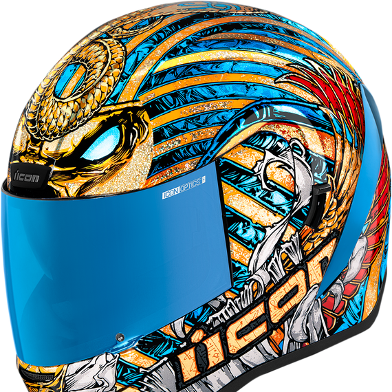 Caracteristicas: Injection molded polycarbonate shell for strength Internal airflow geometry Continuous venting system Sculpted neck roll Fog-free ICON Optics™ Shield with Rapid-Release™ System Prolock™ positive shield locking system Internal Dropshield™ with exterior switch The Dropshield™ visor must only be used while the main face shield is in the fully closed position Removable molded breath deflector Removable Hydradry™ 3-piece moisture wicking liner Internal speaker pockets work with ICON's R.A.U. Bluetooth device Includes Clear & RST Blue ICON Optics™ Shield
