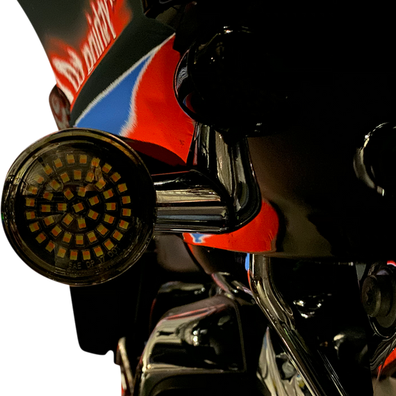 Caracteristicas: 32 super bright dual-color LEDs producing full white running light (Halo Free) with full amber turn signal 1157 pigtail bulb base for plug and play front turn signal applications As required by Federal Motor Vehicle Safety Standard FMVSS108, when turn signal is activated the white DRL turns completely off providing greater visibility to the amber turn signal Sold as a pair for either bullet style models with pop-off style turn signal lenses with tabs OR flat style turn signals on models with turn signal lenses held on with 2 screws DOT Compliant when used behind Custom Dynamics® smoked or clear motorcycle turn signal lens (sold separately)