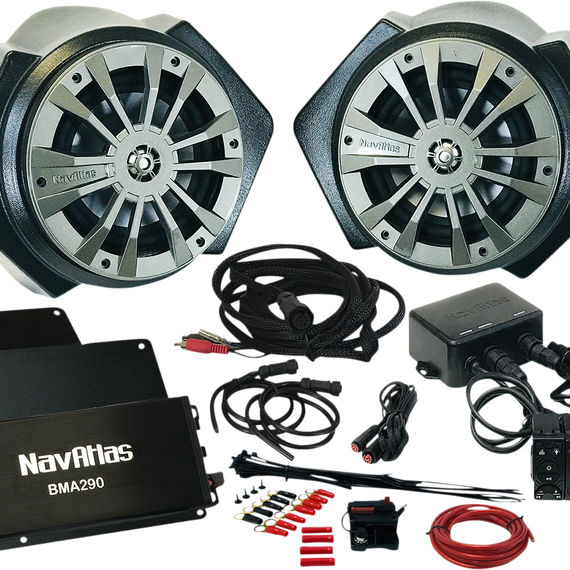 Caracteristicas: Kit includes Rocker switch bluetooth control 61/2” RZR speaker and kick panel system with an amplifier Dual amplifier bracket Installation kit with 60A circuit breaker Digital-to-digital cable for connecting amplifier to speakers IP66 rated