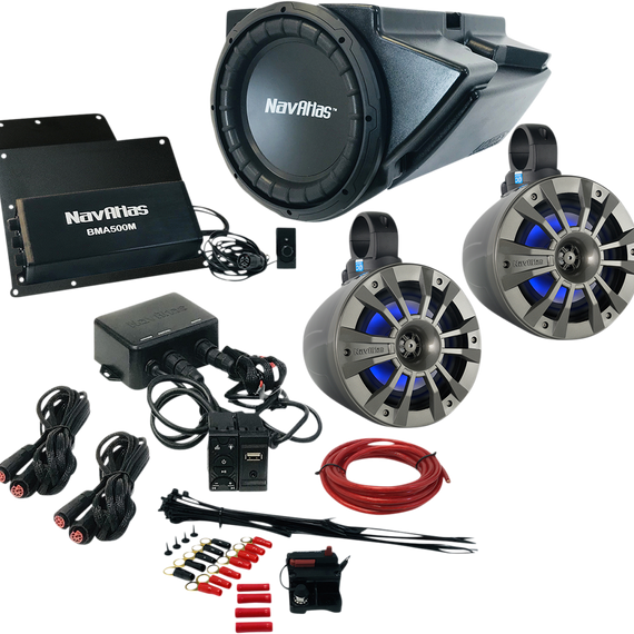 Caracteristicas: Kit includes Rocker switch bluetooth control 6-1/2” 200W RMS full-range Class-D amplified roll-cage speaker system 10” 300W subwoofer and enclosure system w/ 500 W RMS mono subwoofer amplifier Dual amplifier bracket Installation kit with 60A circuit breaker Digital-to-digital cable for connecting amplifier to speakers IP66 rated