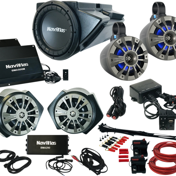Caracteristicas: Kit includes Rocker switch bluetooth control 6-1/2” 200W RMS full-range Class-D amplified roll-cage speaker system 2 6-1/2" kick panel 200 Watts RMS speakers with an amplifier 10” 300W subwoofer and enclosure system w/ amplifier and dual amplifier bracket Three digital-to-digital cables for connecting amplifier to speakers Installation kit with 60A circuit breaker IP66 rated