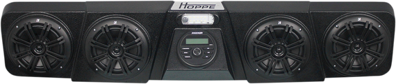 Caracteristicas: Light Features Surface-mounted LED dome light Ultra-bright, high output 150° light dispersion Sealed on/off switch Media Control Center Kicker® KMC2 multimedia gauge-style marine receiver with Bluetooth® AM/FM digital tuner (LED lights may cause signal interference when activated with AM/FM tuner) 200-watt peak power Speakers 4 Kicker® 6-inch KM-Series speakers 4-ohm voice coils 1/2" PEI tweeters Sealed motor structure Tuned to sound great while driving/riding UV-treated polypropylene woofer with Santoprene® Surround Design Features Plug-and-play harnesses with model-matching connectors Black powder-coated steel mounting brackets Fiberglass composite shell designed to match MULE PRO styling Infused resin process layered with directional fiber orientation for ultimate rigidity and strength Rigid design improves sound quality for the cleanest bass and crystal-clear highs Hoppe liner coating with sealed enclosures for durable, all-weather protection Compatible with factory roofs Not compatible with rear view mirror and high-mounted wiper kits in visor