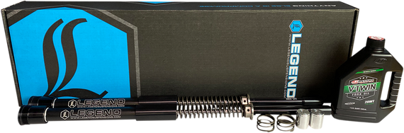 Caracteristicas: Easy installation Includes 2 mono-tube, dual chambered damper cartridges Nitrogen chambers with internal floating pistons Performance spring rate Machined 303 Stainless threaded pre-load adjuster Increased pre-load range allows fine tuning for various riding styles and weights Ride quality is smooth and controlled Improves stability, cornering and traction Eliminates front-end dive during aggressive braking and maneuvering Firm feel for high-speed sweeping turns Eliminates bottoming out on large bumps or potholes Reduces dragging floorboards and pegs Designed for optimum performance with Legend rear suspensions Includes Maxima Racing Oil in cartridge and quart bottle Lifetime Warranty Made by hand in Sturgis, SD USA WARNING: Cancer and Reproductive Harm - www.P65Warnings.ca.gov