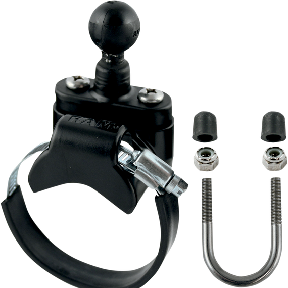 Caracteristicas: Consists of a 1" diameter rubber ball connected at right angles to a base that contains a flexible metal strap The strap base tightening screw is encased in a compact housing for a clean, safe finish Strap is long enough to wrap around handle bar posts, measuring 1.57"-3.15" U-bolt dimensions accommodate rails from 0.5"-1" in diameter Powder-coated marine-grade aluminum