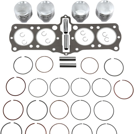 Caracteristicas: Complete engine kits include pistons, ring sets, pistons pins, retainer clips and head gasket All Wiseco pistons are forged from aerospace aluminum alloys on Wiseco's state-of-the art forging presses Built on a legacy of championships for over 60 years by American craftsmen Wiseco pistons have the latest dyno-tested technology to out-perform the competition