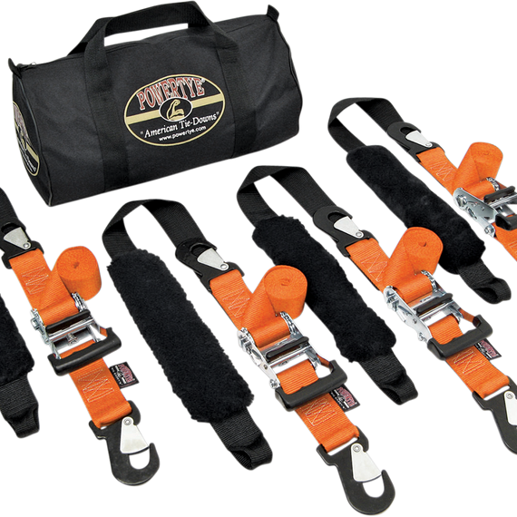 Caracteristicas: 2" wide heavy-duty ratchet with ergonomic rubber handle Genuine sheepskin sleeve Black webbing Soft-Tye sewn-in 7,400-lb. test nylon webbing Heavy-duty vinyl-coated secure hooks 1,200-lb. working load Double-security stitching Include heavy-duty Cordura® storage bag with zipper top closure Made in the U.S.A.