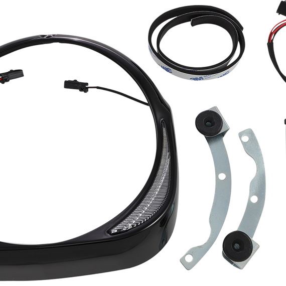 Caracteristicas: Simple and stylish way to put additional lighting on the front of the motorcycle Perfectly sculpted to fill the space around the headlight and streamline the look of the fairing Features fang-shaped LED white running lights to set the bike apart from the rest Easy installation on headlight; includes everything needed Plug and play into the factory wire harness Easily removed to service the headlight Black bezel is ready to paint for a custom color match