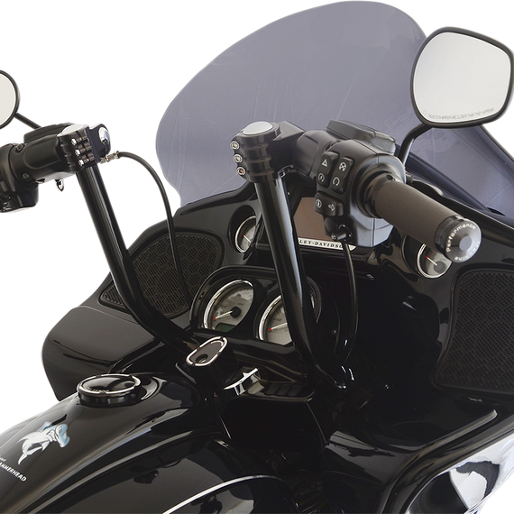 Caracteristicas: Innovative bars present the ultimate in rider personal adjustment and fit Offer more pullback than the standard Klip Hanger bars for a more relaxed ride Unique "Klamps" allow control/grip portions of the handlebar to be adjusted in several directions; rider can tailor to his/her exact liking Bar sections are manufactured from DOM tubing, 'Klamps' are machined from 6061 billet aluminum, all hardware is stainless steel All feature a fully knurled riser clamp area for standard 5-1/4" width 1” risers All are drilled/slotted for wiring and bar end is notched for Throttle-By-Wire applications All include chromed, billet aluminum, domed bar end plugs for a finished look Works with HD OEM Heated Grips Made in the U.S.A.