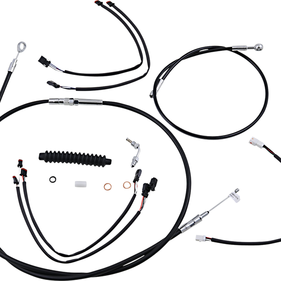 Caracteristicas: Magnum XR Handlebar Installation Kits offer a great fit and excellent quality at an economical price Kit features highly polished, chrome plated fittings All cables are a low effort, high efficiency design that meets or exceeds all OE specifications for fitment, construction, endurance Magnum XR Brake Lines use an enhanced construction of heavy gauge stainless steel embedded in tough abrasion resistant nylon outer jacket for superior durability and extreme braking response for safe riding The coating on cables and brake lines offers exceptional protection for paint or chrome Kits that include manifolds use an all brazed construction to ensure optimal OE fitment and appearance Manifolds use -3 AN connections for an easy installation Kits include throttle and idle cables or throttle-by-wire extensions, clutch cable or XR hydraulic clutch line, XR brake lines, copper crush washers, hardware, turn signal and switch wiring extensions Kits are based on using ape hanger style handlebars and 2" risers.