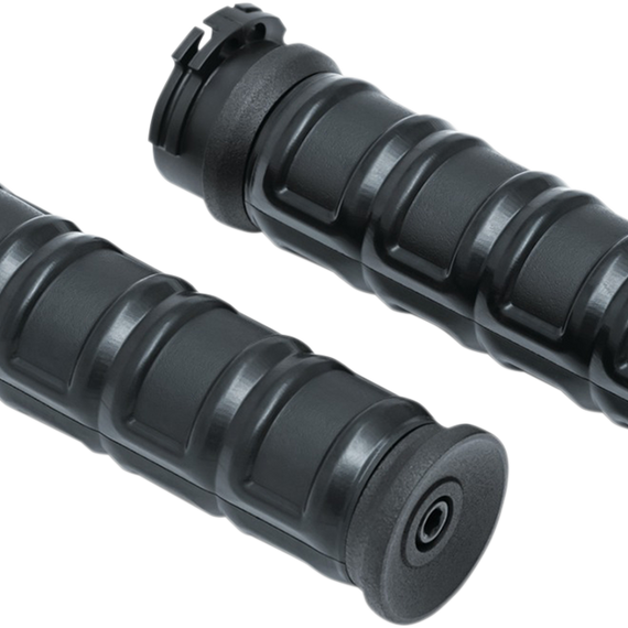 Caracteristicas: Dillinger Grips combine a narrow profile with ribbed EPDM rubber for aggressive grip, commanding control and a soft, vibration-dampening foundation to combat hand and forearm fatigue Durable ribbed EPDM rubber provides comfortable grip, vibration dampening, and will not hard, crack or wear over time Features aluminum collars and removable end caps for use/installation of bar-end mirrors, turn signals or weights