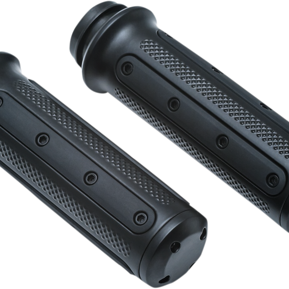 Caracteristicas: Grip housings are cast-aluminum construction Form-fitted premium EPDM rubber compound inserts for comfort, durability and longevity Knurled areas between the rubber pads provide added grip Matching aluminum end caps included