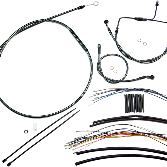 Caracteristicas: The only complete kits with matching braided cables and brake lines Kits include throttle and idle cables of throttle-by-wire extensions, clutch cable or hydraulic clutch line, brake lines, copper crush washers, hardware, and any necessary switch wiring of turn signal extension All cables are a low-effort, high-efficiency design that meets or exceeds all OE specifications for fitment, construction, endurance Kits for dual disc models include an all brazed manifold that eliminates leaks, alignment problems and unattractive threaded connections Assembled in the U.S.A. Kits are based on using ape hanger style handlebars with 2” risers
