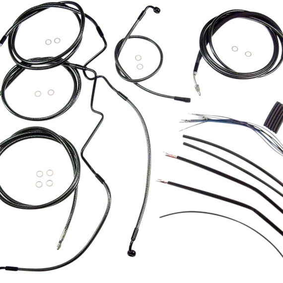 Caracteristicas: The only complete kits with matching braided cables and brake lines Kits include throttle and idle cables of throttle-by-wire extensions, clutch cable or hydraulic clutch line, brake lines, copper crush washers, hardware, and any necessary switch wiring of turn signal extension All cables are a low-effort, high-efficiency design that meets or exceeds all OE specifications for fitment, construction, endurance Kits for dual disc models include an all brazed manifold that eliminates leaks, alignment problems and unattractive threaded connections Assembled in the U.S.A. Kits are based on using ape hanger style handlebars with 2” risers
