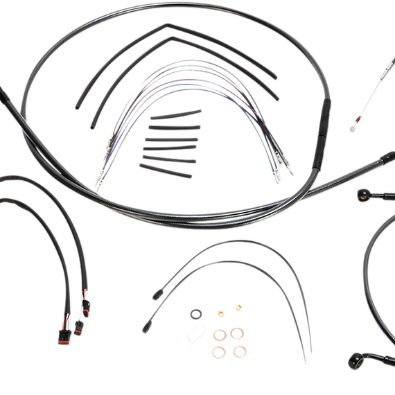 Caracteristicas: The only complete kits with matching braided cables and brake lines Kits include throttle and idle cables of throttle-by-wire extensions, clutch cable or hydraulic clutch line, brake lines, copper crush washers, hardware, and any necessary switch wiring of turn signal extension All cables are a low-effort, high-efficiency design that meets or exceeds all OE specifications for fitment, construction, endurance Kits for dual disc models include an all brazed manifold that eliminates leaks, alignment problems and unattractive threaded connections Assembled in the U.S.A. Kits are based on using ape hanger style handlebars with 2” risers