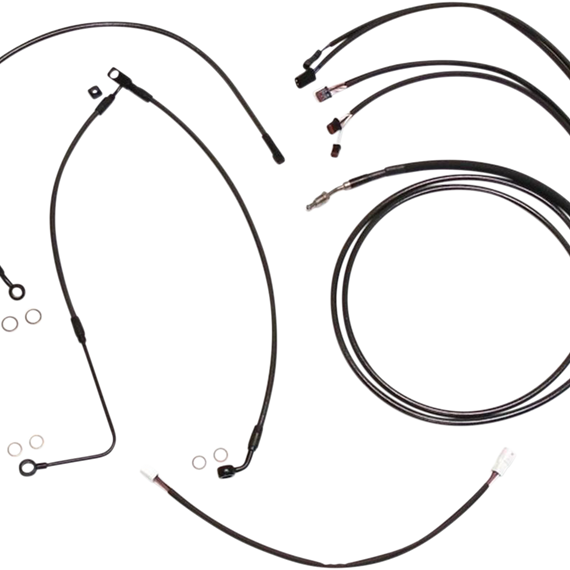 Caracteristicas: The only complete kits with matching braided cables and brake lines Kits include throttle and idle cables of throttle-by-wire extensions, clutch cable or hydraulic clutch line, brake lines, copper crush washers, hardware, and any necessary switch wiring of turn signal extension All cables are a low-effort, high-efficiency design that meets or exceeds all OE specifications for fitment, construction, endurance Kits for dual disc models include an all brazed manifold that eliminates leaks, alignment problems and unattractive threaded connections Assembled in the U.S.A. Kits are based on using ape hanger style handlebars with 2” risers