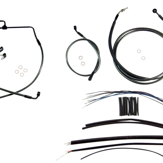 Caracteristicas: The only complete kits with matching braided cables and brake lines Kits include throttle and idle cables of throttle-by-wire extensions, clutch cable or hydraulic clutch line, brake lines, copper crush washers, hardware, and any necessary switch wiring of turn signal extension All cables are a low-effort, high-efficiency design that meets or exceeds all OE specifications for fitment, construction, endurance Kits for dual disc models include an all brazed manifold that eliminates leaks, alignment problems and unattractive threaded connections Assembled in the U.S.A. Kits are based on using ape hanger style handlebars with 2” risers