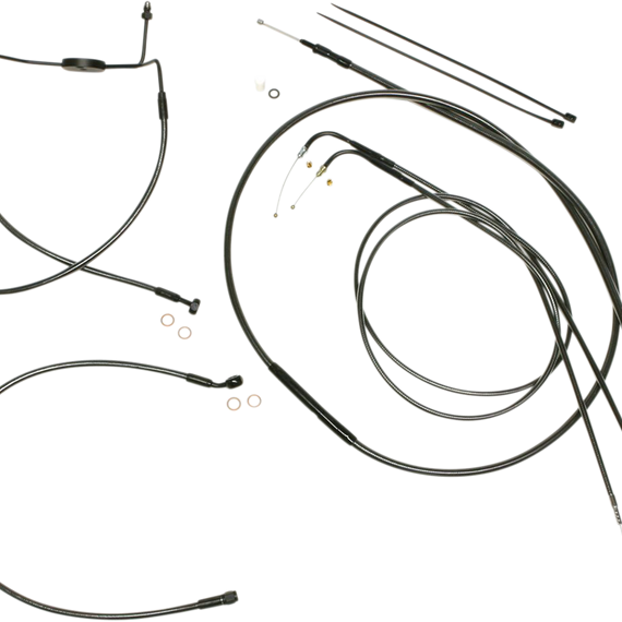Caracteristicas: The only complete kits with matching braided cables and brake lines Kits include throttle and idle cables of throttle-by-wire extensions, clutch cable or hydraulic clutch line, brake lines, copper crush washers, hardware, and any necessary switch wiring of turn signal extension All cables are a low-effort, high-efficiency design that meets or exceeds all OE specifications for fitment, construction, endurance Kits for dual disc models include an all brazed manifold that eliminates leaks, alignment problems and unattractive threaded connections Assembled in the U.S.A. Kits are based on using ape hanger style handlebars with 2” risers